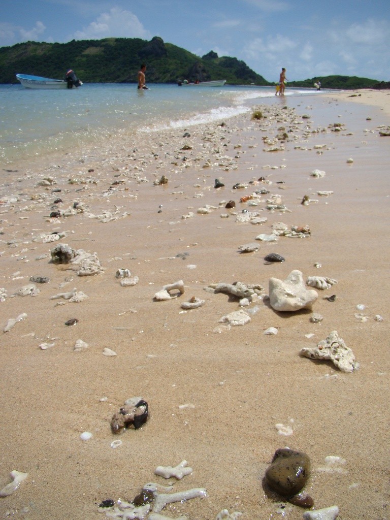 Fiji’s islands (most of which are volcanic), come in various shapes and sizes and they all have their own charm. From our boat ride up to the Yasawas we became fully aware of what laid ahead – beautiful sandy beaches outlining lush island vegetation or long beaches interrupted by rugged volcanic rocks. Some islands seemed very desolate which explains why movies like Cast Away were shot out there. Not to mention that they all sit in the most appealing shades of blue waters with deep clarity. Snorkeling and scuba diving are big here and the coral reefs around some of the islands are simply underwater magic. On one of the days we went snorkeling (on a guided tour), several miles out in the ocean. It was a bit rainy at first so with the hanging mist there was no sight of any land. It was ocean all around with the exception of our boat which for some reason disappeared at one point. From then on it was all water and the beautiful world underneath. The coral reef and tropical fish were quick to put our minds at ease as we took it all in. But the real reason we were there was reef sharks (white fintips), which appeared after sensing our presence. There were about 6 or 7 ranging in size anywhere from 3 to 6 feet. They were curious and somewhat friendly swimming around us. Sam (our guide), kept grabbing and holding some of them so we could touch their silky smooth skin while taking intimate notice of their firm musculature just beneath. Apparently this is a daily ritual for Sam, talk about a hands-on job! The other thing that struck us was how two of Sam’s friends went spearfishing a couple of miles away from where we snorkeled. We had dropped these guys off on our way to the reef and after our swim with the sharks we went to pick them up. We located one of them right away but the other guy took some time to find. After all the ocean is quite big and it all looks the same. Apparently they do this everyday as well. It’s the Fijian way of life as we learned.